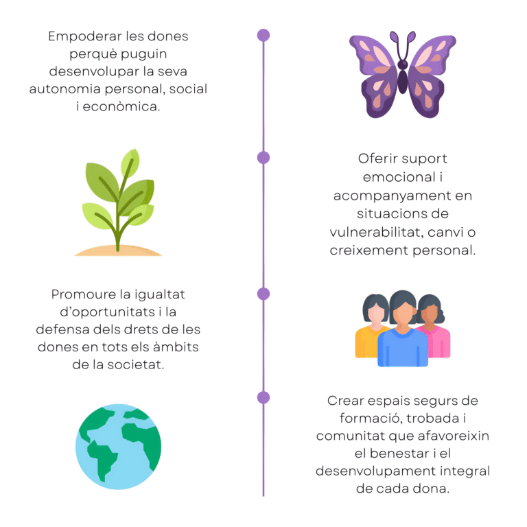 Creiem profundament en la força de la comunitat. Per això desenvolupem projectes i serveis que donen resposta a les necessitats de les dones: assessorament, suport emocional, orientació laboral, formació, activitats de benestar i espais de trobada on compartir, aprendre i créixer plegades.